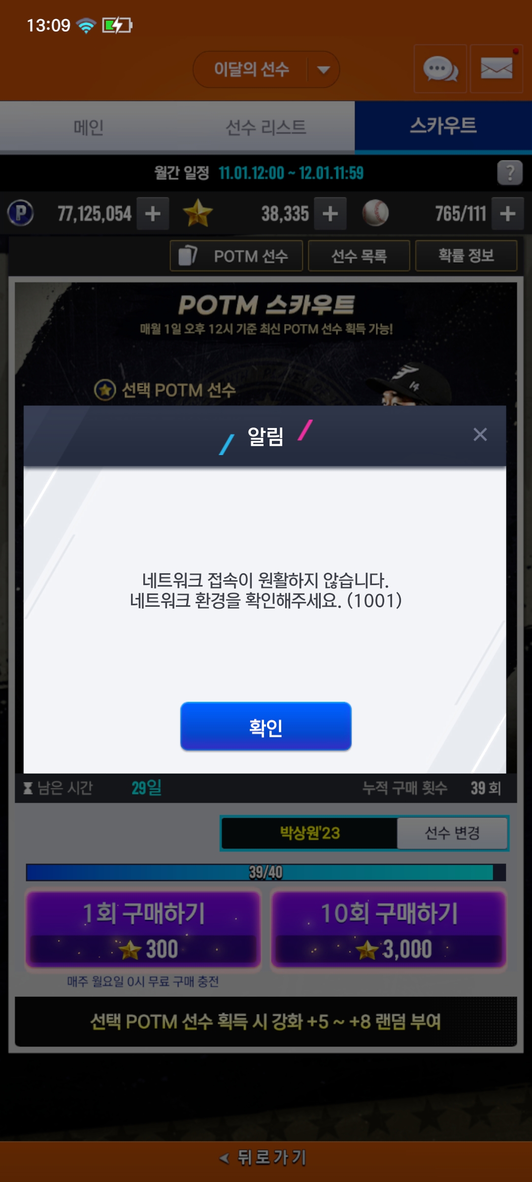 POTM 스카우트 40회 사서 POTM 한화 박상원 선수 받을 차롄데 이순간 계속 네트워크 연결이 안된다고 무한 루프를 돌고 있습니다 이런 사소한것도 검증 안하고 릴리즈 하나요?