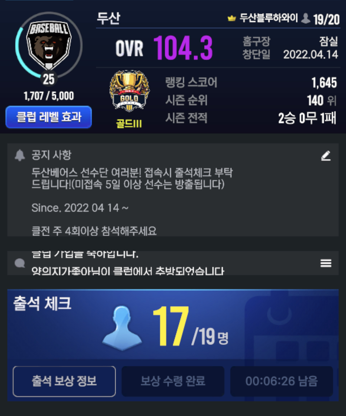 클전 필참해주실 ovr 100이상 두산 구단주님 환영합니다