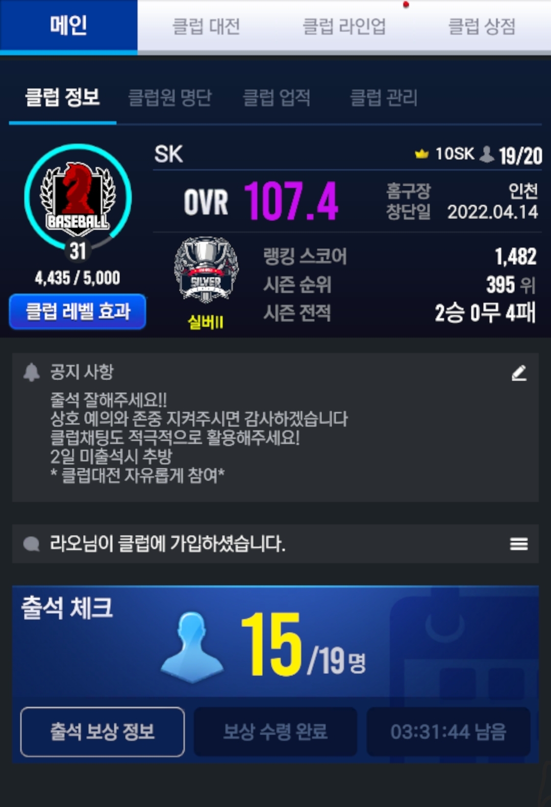 클럽대전 의무 참여는 아니지만 매일 열 분 이상 참여해서 평균 골드III으로 마무리합니다~!