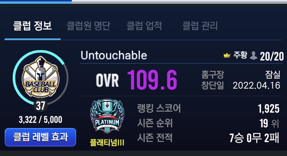 <클럽소개 > : 꾸준히 in50위권을 들고 있으며 향후 in40, in30에 꾸준히 이름을 올리고자 하는 클럽입니다. 평균 오버롤이 그리 높지 않은 클럽이지만, 클럽원의 성실한 참여로 오버롤에 비해 높은 성적을 기록중입니다.