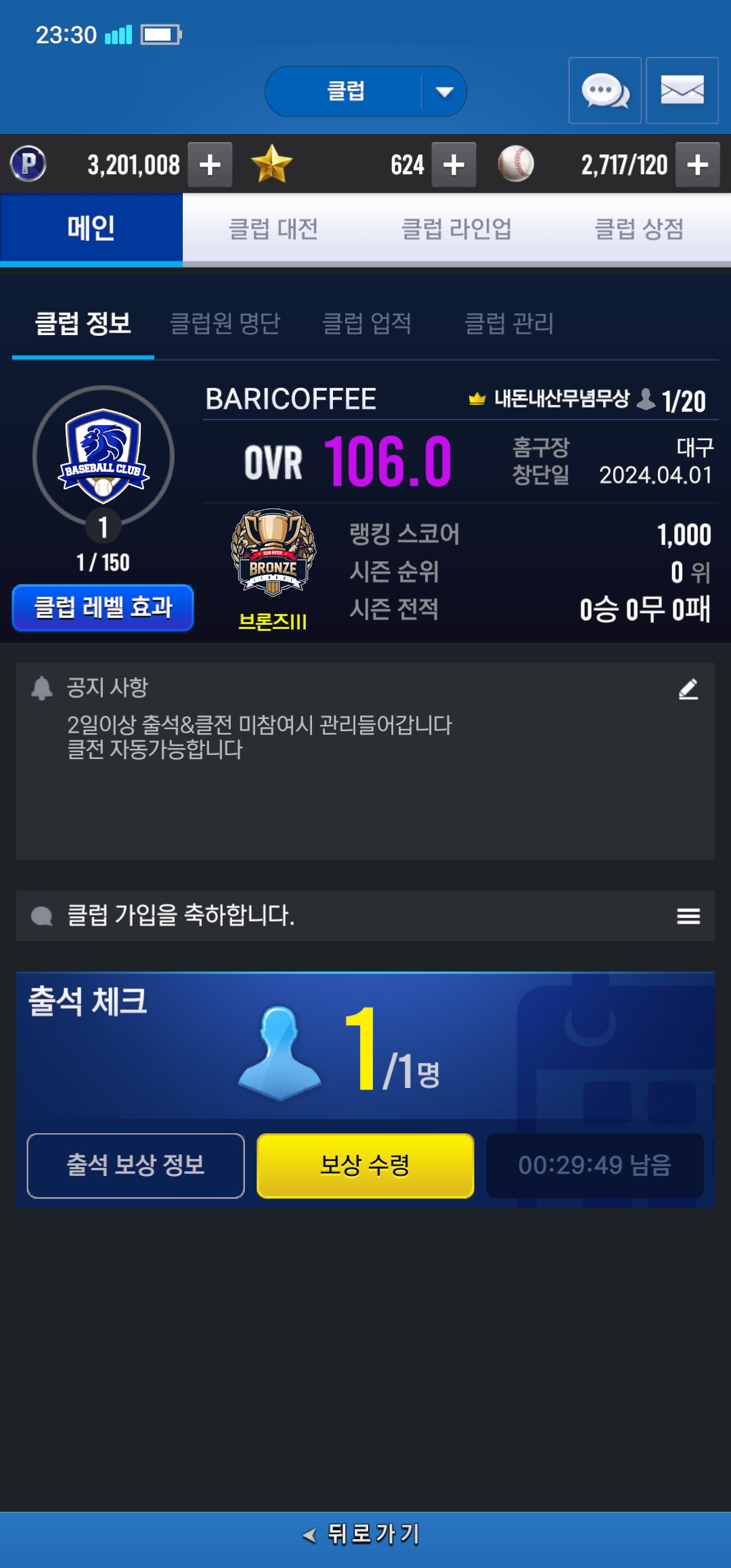 2일이상 출석&클전 미참여만 안하시면 됩니다 클전승패상관없이 편하게 가입하세요(자동가능)