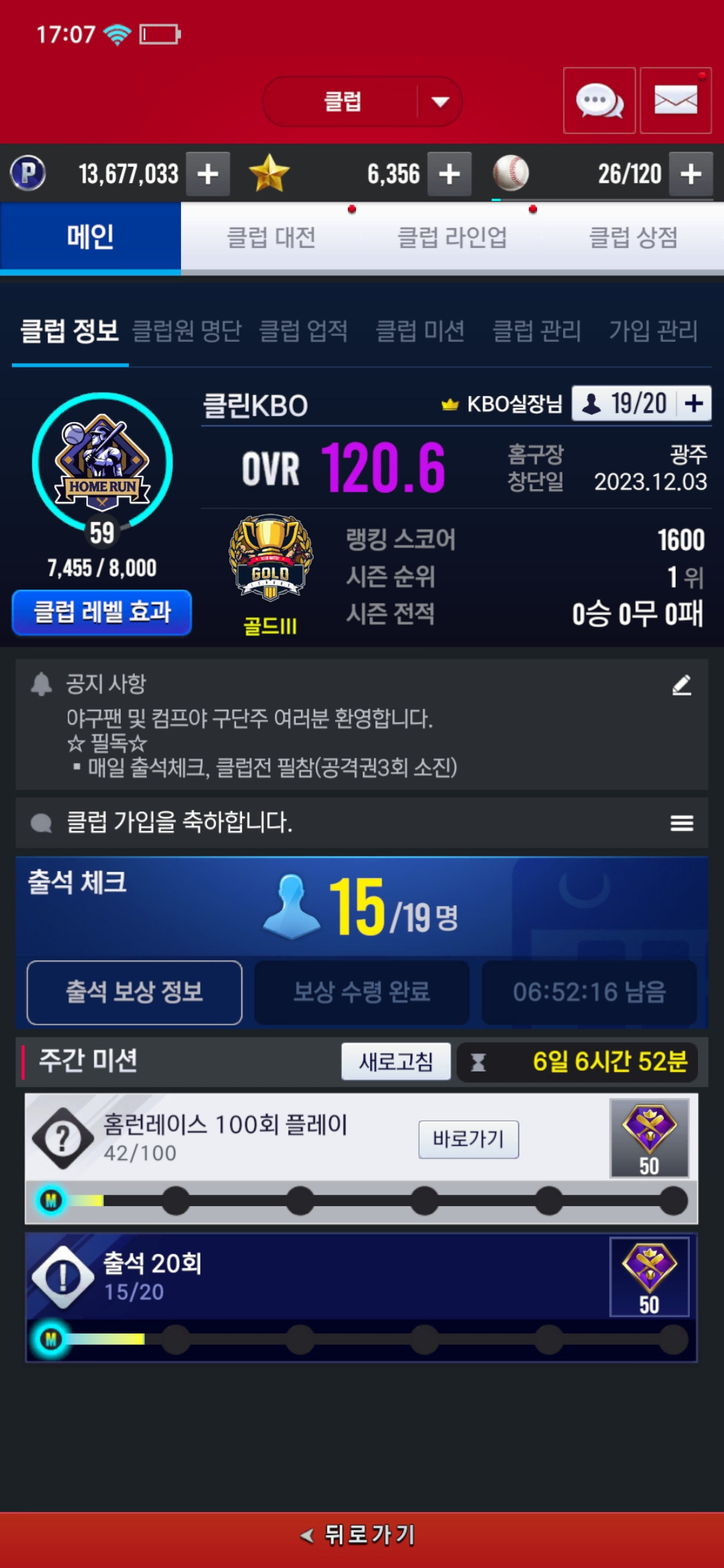 클린KBO 에서 건실한 구단주님 모십니다. OVR+116( 평균120.6/클럽레벨59)