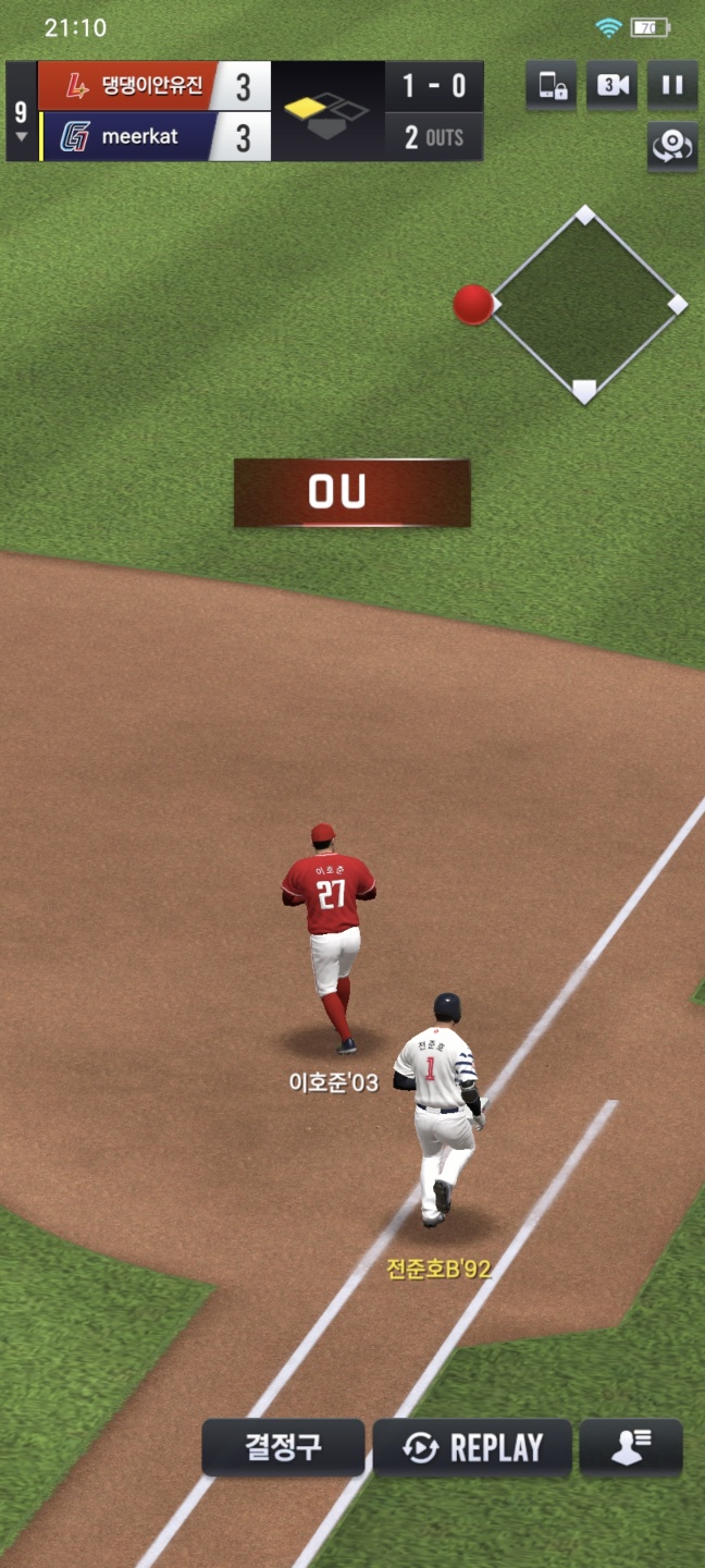 확실히 아웃판정이 났고 2사 3루로 상황이 바뀐것을 알 수 있습니다