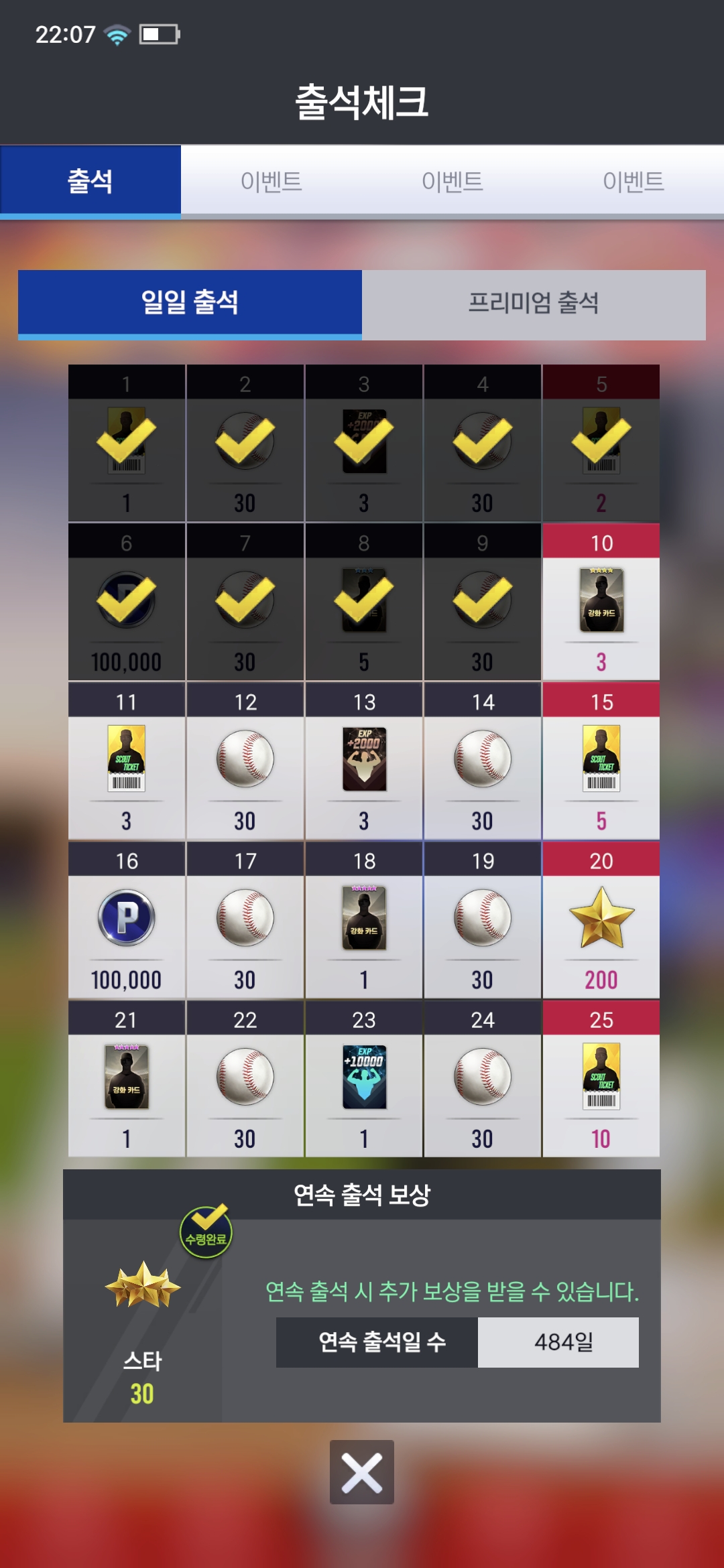 연속 출석일 수 100일 이상이면 받습니다.